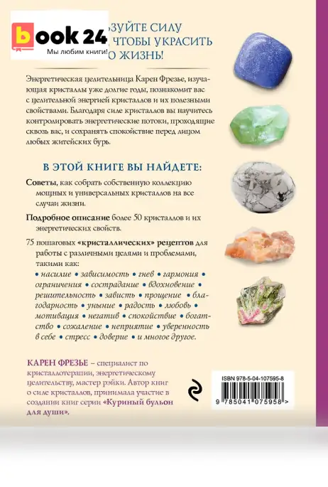 Узнайте, как сделать свою жизнь искрящейся, яркой и полной энергии с помощью целительных кристаллов! Даже если вы никогда прежде не работали с кристаллами, в этой книге вы найдете все необходимое, чтобы обратиться к их силе. Вы узнаете, как кристаллы воздействуют на нас, с каких камней лучше начать и как их правильно использовать. Автор книги, специалист по кристаллотерапии, Карен Фрезье дает подробные практические советы, как с помощью кристаллов избавиться от стресса, тревожности, негативных эмоций и привлечь к себе любовь, уверенность и позитивную энергию, рассказывает о технике безопасности при работе с кристаллами и мифах, их окружающих. Благодаря 50 детальным описаниям и красочным изображениям кристаллов как в обработанном, так и в природном виде, вы легко сможете сориентироваться в их изобилии и подобрать "свой" камень или собрать целую коллекцию на все случаи жизни.