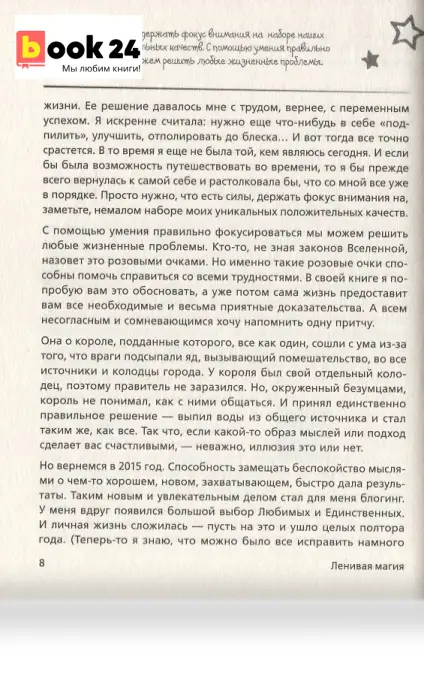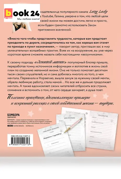 Любой человек может стать тем, кем захочет, получить то, что желает получить, – в какой бы отправной точке он ни находился. Вселенная всегда дает нам то, что мы просим. Главное, соблюдать несколько простых условий. Хорошо себя чувствовать здесь и сейчас. Не просто знать алгоритм действия Закона притяжения, но и проживать его каждый день. И быть готовыми принять то, о чем мечтаем. Галина Бондарь – создатель популярного канала Lazy Lady на Youtube, где она рассказывает о том, как сделать свою жизнь лучше. Почему «ленивая»? Потому что, живя в мире, требующем от нас бесконечных бессмысленных действий, важно помнить, что нашу жизнь творят не усилия, а, прежде всего, мысли. А потом уже реальность подстраивается под работу разума. Именно поэтому в жизни так и получается, что одним – все, а другим – ничего. В своей книге-практикуме Lazy Lady убедительно доказывает: у вас УЖЕ есть все, чтобы получить желаемое. Верьте в то, что у вас УЖЕ все прекрасно. И вы достаточно хороши для того, чтобы обрести желаемое. Не нужно к чему-то готовиться, становиться мудрее, талантливее, копить навыки, которые помогут достигнуть цели. Главная цель этой книги – чтобы через короткое время вы смело могли назвать себя «везунчиками». Просто позвольте себе быть счастливыми.