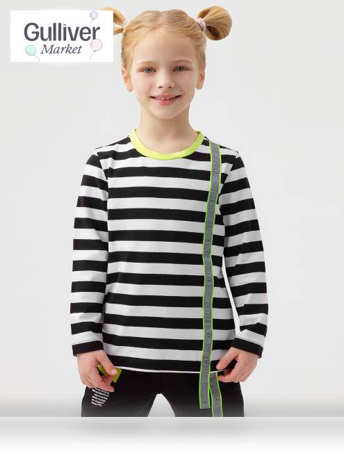 Черно-белый лонгслив в полоску для девочки с округлой горловиной и яркими акцентами. Мягкая хлопковая ткань джерси является приятным на ощупь и воздухопроницаемым материалом. Добавленный в состав эластан повышает прочность изделия и позволяет ему подстраиваться под фигуру ребенка. Футболка с длинным втачным рукавом прямого кроя обеспечит свободную посадку и легкость в каждом движении. Стильные дизайнерские акценты в виде салатовой горловины, полоски с логотипом Button Blue и неглубоких боковых разрезов будут дарить ребенку хорошее настроение и уверенность в себе. Лонгслив в околоспортивном стиле. Модель можно использовать для занятий спортом. Детская футболка с длинным рукавом представлена в размерах от 98 до 128.