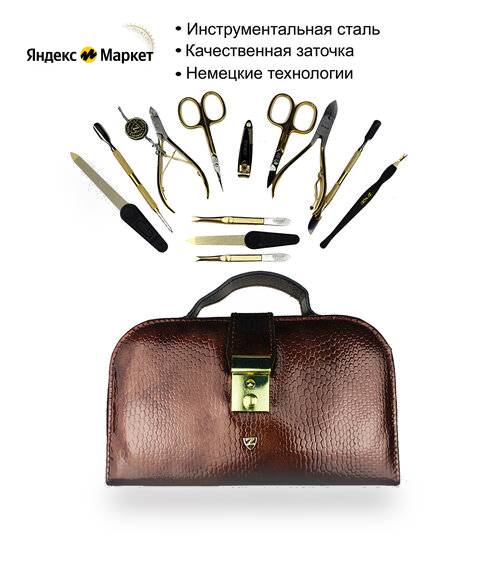 Стильный и солидный набор инструментов для маникюра и педикюра Zinger MS-1101 BG в футляре-книжке, верхняя часть которого выполнена из натуральной кожи, а внутренняя из велюра. В специальном отсеке футляра можно разместить лаки для ногтей, средства для ухода за ногтями и кутикулой или другие нужные именно вам предметы. Инструменты выполнены и высококачественной стали марки AISI 420 (40Х13). Технология закалки позволяет сочетать необходимую упругость и высокую твёрдость металла. Вся серия заточена вручную, по стандартам мастеров маникюра: с дополнительной обработкой лезвий и полировкой кончиков. Категория заточки - 3. Заточки хватает на 3-4 года активного домашнего использования или 1 год профессионального использования. Комплектация набора позволяет использовать его не только в домашних условиях, но и для выполнения профессиональных маникюрных и педикюрных работ. Футляр оснащен удобной ручкой для переноски и может быть закрыт на замок-автомат, открыть который можно с помощью ключа, входящего в комплект набора.