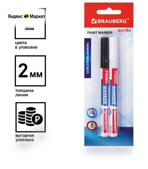 Маркер-краска лаковый EXTRA (paint marker) 2 мм, набор 2 цвета, белый/черный, усиленная нитро-основа, BRAUBERG, 151993 продается в интернет-магазине Яндекс Маркет