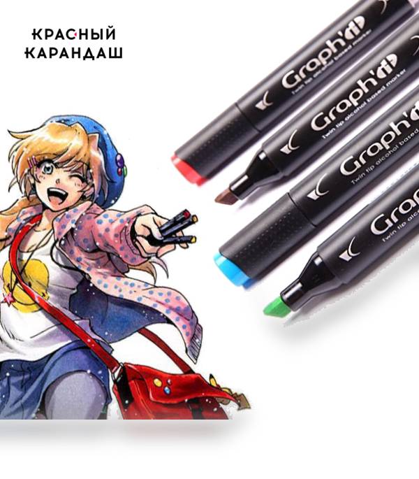 GRAPH'IT Brush - это спиртовые двусторонние маркеры, оснащенные двумя видами наконечников - тонким линером и мягкой кистью. Толщина мягкого наконечника варьируется от 0.1 до 1см, толщина линера - 0,5 мм. Маркеры изготовлены из сложного полиэфира высокой плотности, что обеспечивает им хорошую прочность и долговечность. Также решающую роль в долговечности играет герметичность маркеров. Крышечки Маркеров GRAPH'IT при закрытии издают щелчок, который является гарантом полного закрытия маркера. Корпус маркеров треугольной формы с закругленными краями невероятно удобно держать в руке, к тому же, такая форма обеспечивает отсутствие скольжения по гладкой поверхности стола. Для большего удобства код оттенка каждого маркера отображен на колпачках. Маркеры на спиртовой основе GRAPH'IT идеально используются как на плотной или макетной бумаге, так и на специализированной маркерной бумаге. Они станут идеальными компаньонами для студентов художественных вузов, архитекторов, любителей комиксов.