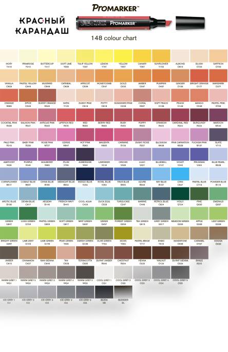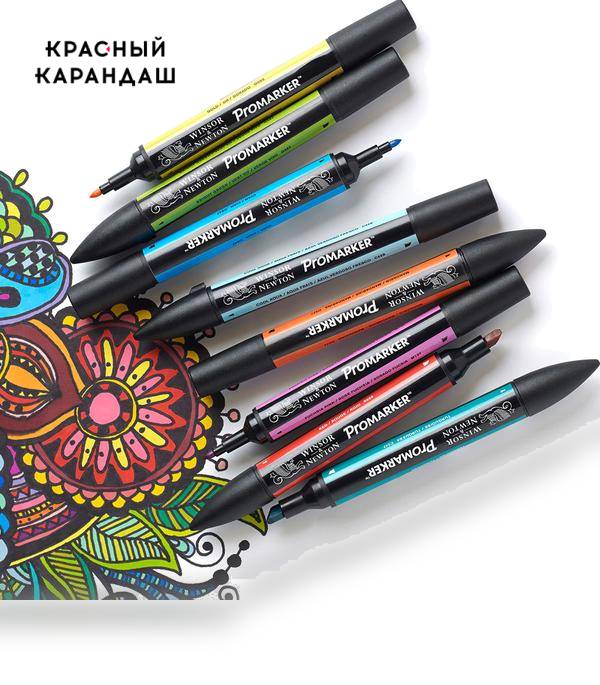 Маркеры ProMarker заправлены перманентными чернилами на спиртовой основе. Такие маркеры — уникальный инструмент для иллюстраторов, студентов и просто творческих людей. Серия ProMarker обладает широкой палитрой цветов, начиная от пастельных до самых ярких. Маркеры обладают двумя наконечниками — пулевидный и скошенный (2мм/7мм). Объема одного маркера хватает на сплошное закрашивание 2,7 листов формата А3. Полупрозрачные чернила отлично смешиваются между собой. Так же можно накладывать один слой на другой, расширяя количество оттенков. Маркеры ProMarker представлены поштучно палитрой из 148 цветов и в наборах различной комплектации. Маркеры ProMarker («ПроМаркер») изготавливается английской компанией Winsor&Newton («Винзор энд Ньютон»), которая работает на рынке художественных товаров с 1832 года. Компания получила название в честь основателей – химика Уильяма Винзора и художника Генри Ньютона. Winsor&Newton – одна из известнейших компаний на художественном рынке, ассортимент которой представлен не только художественными красками, но и материалами для графических и каллиграфических работ, а также вспомогательными средствами для живописи.