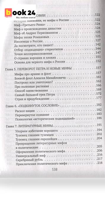 Мифы… Их создание — ​древнейшее свойство человеческого разума. Одни мифы рождаются спонтанно, другие — ​целенаправленно. Какие-то совершенно безобидны, а другие — ​неиссякаемый источник страха, ненависти или презрения в отношении целых народов… Эта книга — ​увлекательнейшая история самых ярких и живучих мифов о России и русских. Откуда они взялись? Есть ли у них реальная историческая основа? Как с такими же проблемами обстоят дела на "цивилизованном" Западе? И что заставляет нас самих верить в откровенные выдумки? Возможно, осмыслив трезво свое прошлое и избавившись наконец от ложных представлений о самих себе, мы сможем понять, кто мы и куда идем. "Если я усну и проснусь через сто лет, и меня спросят, что сейчас происходит в России, я отвечу: "Пьют и воруют". М. Е. Салтыков-Щедрин??? (нет, его авторство — ​очередной миф, раскрученный в соцсетях).