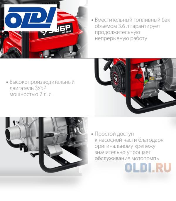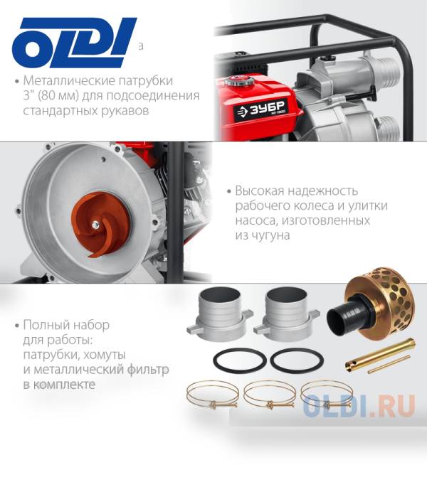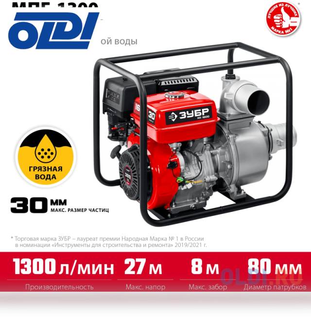 Бензиновая мотопомпа Denzel PX-80D7 99206 с двигателем мощностью 7 л. с. и штуцерами диаметром 3" обеспечивает напор 30 м и применяется для откачки грязной воды со скоростью 1300 л/мин из затопленных помещений, а также бассейнов, котлованов, траншей, погребов, колодцев глубиной до 8 м. Диаметр входного и выходного отверстий составляет 80 мм, что обеспечивает высокую производительность. Мотопомпа оптимальна для использования во время земляных работ, т. к. может работать с сильно загрязненной водой, содержащей фракции диаметром до 30 мм. Также подходит для подачи чистой воды на строительную площадку, небольшое предприятие, дачный участок и в систему полива. Преимущества. Надежность и долговечность — двигатель Denzel Long Life из высококачественных комплектующих обеспечивает длительную стабильную работу. Низкий расход топлива — бак объемом 3 л позволяет работать до 1,5 часов без дозаправки. Возможность изменения интенсивности потока воды — производитель предусмотрел опцию регулировки оборотов двигателя. Необходимые инструменты в комплекте — мотопомпа поставляется с хомутами и инструментами для подключения шланга. Характеристики: Колеса и ручки в комплекте нет. Объем двигателя, см³ 212. Мощность, л. с. 7. Аккумулятор в комплекте нет. Гарантия 3 года. Датчик низкого уровня масла да. Диаметр входного отверстия, мм 80. Диаметр выходного отверстия, мм 80. Максимальное всасывание, м 8. Максимальный напор, м 30. Максимальный размер твёрдых частиц, мм 30. Назначение для сильнозагрязнённой воды. Объем масла в картере, л 0,6. Объем топливного бака, л 3. Производительность, л/мин 1300. Расход топлива, л/ч 1,9. Стартер ручной. Тактность двигателя 4-х тактный. Тип двигателя бензиновый. Топливо АИ-92. Уровень шума, дБ 110. Комплектация: Мотопомпа 1 шт. Фильтр всасывающий 1 шт. Штуцер 3" 2 шт. Комплект инструментов 1 шт. Комплект хомутов 1 шт.Руководство по эксплуатации с гарантийным талоном 1 шт.