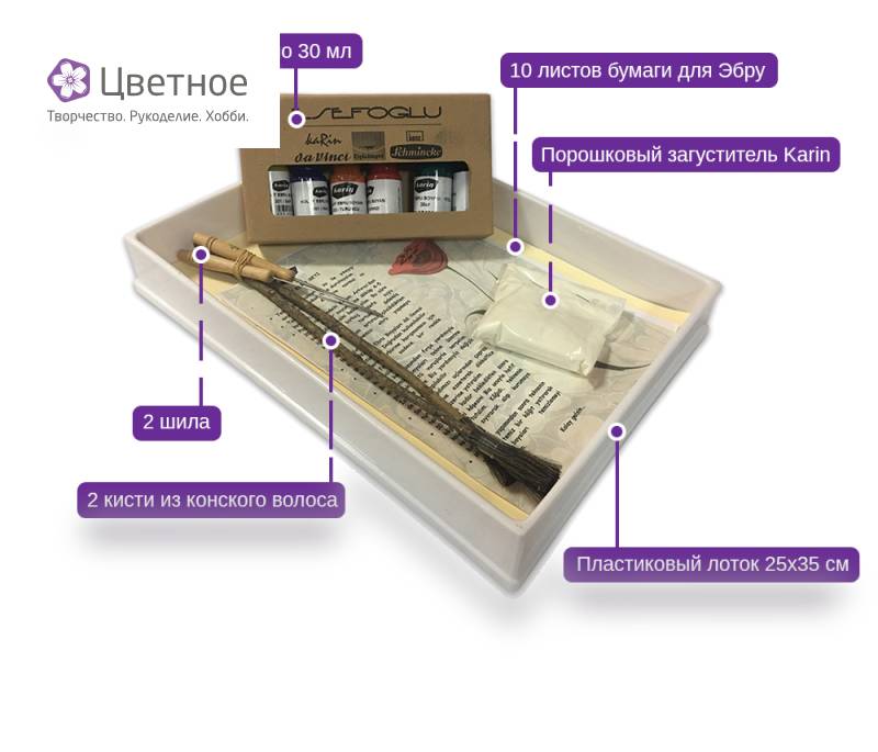 Рисование на воде в технике эбру – древнее искусство создания узоров на поверхности воды с последующим их переносом на бумагу, ткань, гипс, керамику, и любую другую шершавую поверхность. В набор входят: 7 баночек со специальной краской (красный, синий, зеленый, белый, желтый, фиолетовый, оранжевый), 1 пластиковый лоток размером А4, бумага 30 листов размером А4, 4 саше с загустителем, кисть, гребень, 3 деревянных шпажки, подробная творческая инструкция.