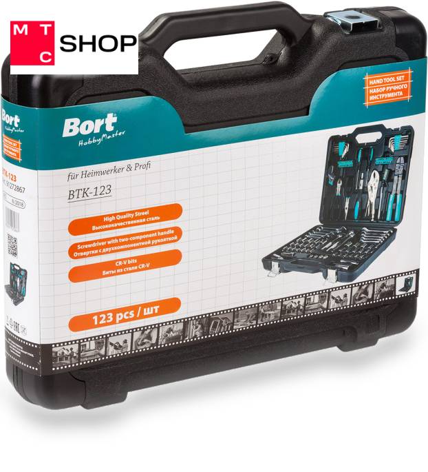 **Набор инструментов Bort BTK-100** предназначен для выполнения широкого спектра работ. Подходит для использования в быту и на производстве. Пригодится в гараже, мастерской. С помощью этих инструментов можно выполнить любые сантехнические работы, заменить или отремонтировать электрику, собрать деревянные конструкции.