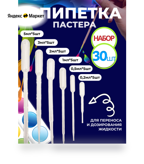 Пипетка пастера пластиковая набор 0,5 мл, 0,2 мл, 1 мл, 2 мл, 3 мл, 5 мл по 3 шт - Мерные пластиковые нестирильные пипетки, на которых начерчена рельефная градуировка. Пипетка детская для творчества незаменимый инструмент для людей, занимающихся мыловарением, рисованием, созданием игрушек, а также для медицинских и лабораторных целей. Постоянный диаметр носика позволяет всегда получать каплю заданного объема. Мастер бровист использует пипетку для смешивания краски для бровей, ресниц чтобы точно отмерить состав. Эти медицинские изделия будут так же полезны для мастера маникюра и педикюра. Пипетки так же используются для рисования, эпоксидной смолой, варении свечей и парфюмерии чтобы отмерить отдушку, аромамасло, эфирное масло.