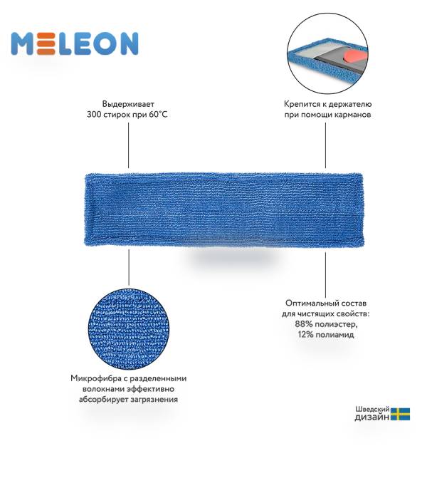 Насадка легко крепится к швабре с помощью специальных кармашков, что очень удобно при сухой и влажной уборке. Высококачественная микрофибра состоит на 88% из полиэстера и на 12% из полиамида.