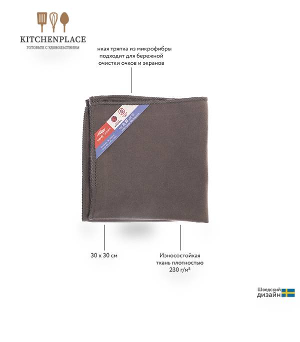 Тряпка из микрофибры предназначена для деликатного очищения оптики, экранов телефонов, планшетов, ноутбуков и телевизоров. Салфетка эффективно удаляет жирные отпечатки, пятна, а также притягивает даже мельчайшие частички пыли. Она не оставляет царапин, ворсинок и разводов, полируя поверхность. Тряпка выдерживает до 300 стирок при температуре до 60?. Она легко отжимается и быстро сохнет. Материал: 70% полиэстер 30% полиамид Размер: 30х30 см