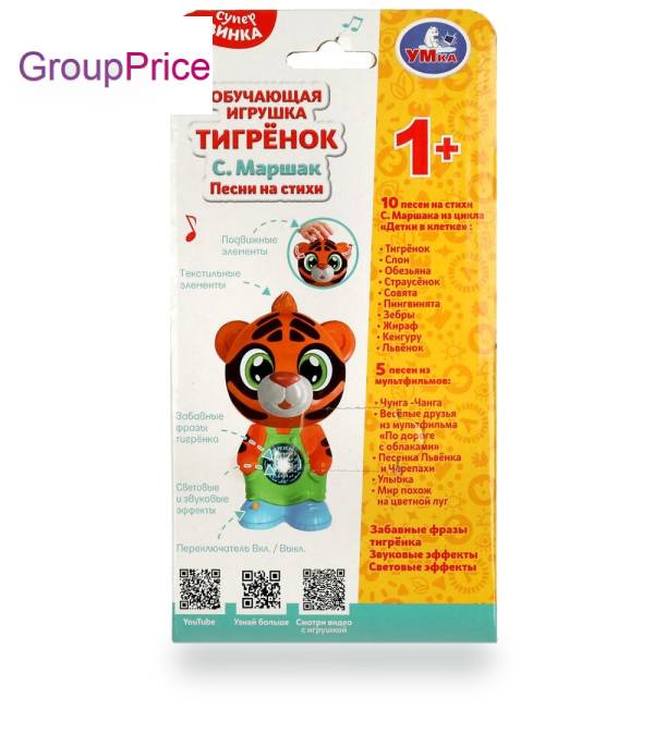 Очаровательный тигренок с головой-трещоткой и световыми эффектами непременно понравится Вашему малышу и займет его на долгое время. Ребенок с удовольствием будет слушать песни на замечательные стихотворения Самуила Маршака, веселые песенки из мультфильмов и забавные звуки.