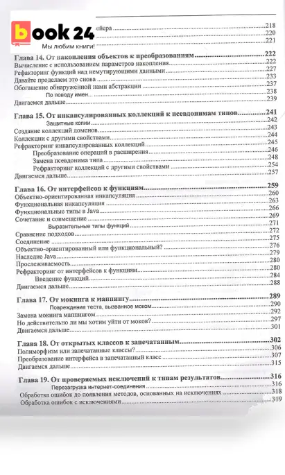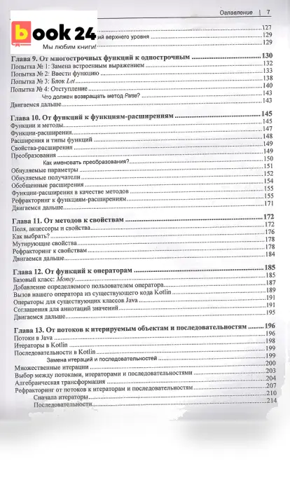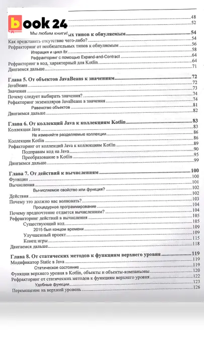 Книга описывает практические приемы рефакторинга и переноса кода написанных на Java мобильных приложений для Android на язык Kotlin с сохранением совместимости. Приведено подробное сравнение этих двух языков, даны примеры перевода проектов с Java на Kotlin, добавления поддержки Kotlin в сборку Java. Показан переход от классов Java к классам Kotlin, от коллекций Java к коллекциям Kotlin, от объектов JavaBeans к значениям, от статических методов к функциям верхнего уровня. Подробно рассматривается обработка ошибок, приведены практические приемы управления проектами со смешанной кодовой базой. Даны советы по рефакторингу кода и функциональному программированию на Kotlin.