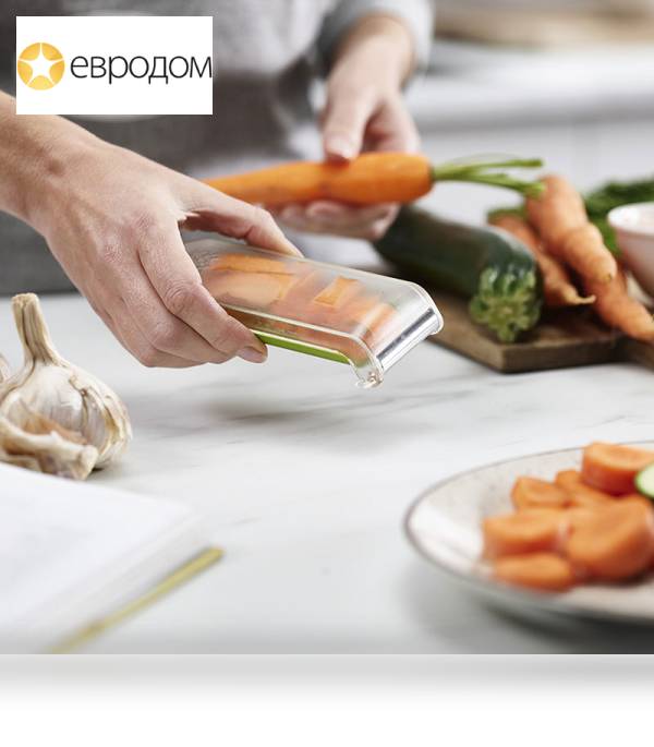 Эта удобная овощечистка помогает свести к минимуму беспорядок при готовке, так как отходы собираются внутри ручки. Овощечистка с острым лезвием из нержавеющей стали собирает отходы во врем я очистки. Благодаря прозрачной стенке вам будет видно, когда она заполнится. Идеально подходит для приготовления небольшого количества овощей и легко опустошается. Материал не содержит Бисфенол-А. Можно мыть в посудомоечной машине. Во время использования и мытья следует держать пальцы подальше от лезвий.