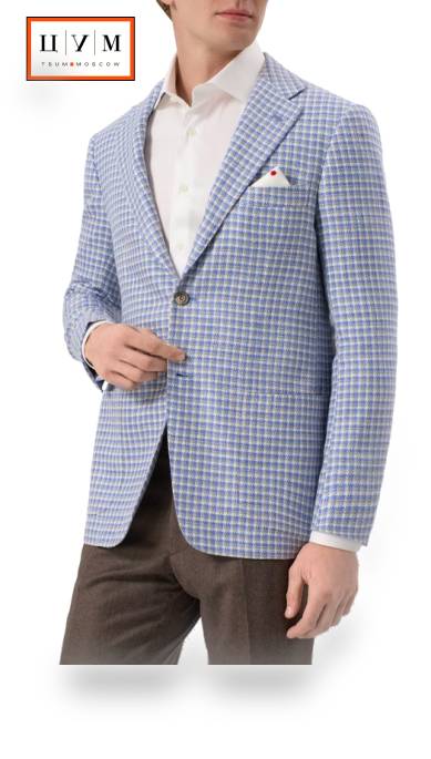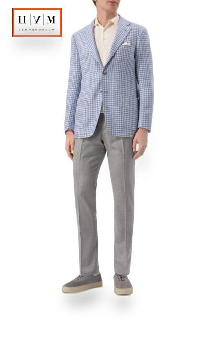 Пиджак с брендированным полуподкладом сшили из клетчатой ткани на основе кашемира, шерсти, шелка и льна. Модель двумя шлицами, внутренним и тремя внешними карманами застегивается роговыми пуговицами. В комплекте — паше с фирменной алой точкой.