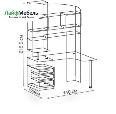 Ширина левой стороны - 140 см; Ширина правой стороны - 108 см; Высота - 215,5 см; Цвет - венге / дуб савона / рисунок море; Материал столешницы - ЛДСП; Материал корпуса - ЛДСП; Ящики - в комплекте; Полка под клавиатуру - не предусмотрена; Надстройка - в комплекте; Подставка для системного блока - не предусмотрена; Наличие колес - не предусмотрены; Полки - в комплекте; Страна - Россия; Гарантия - 12 мес; Вес - 98 кг; Объем - 0,157 куб. м;