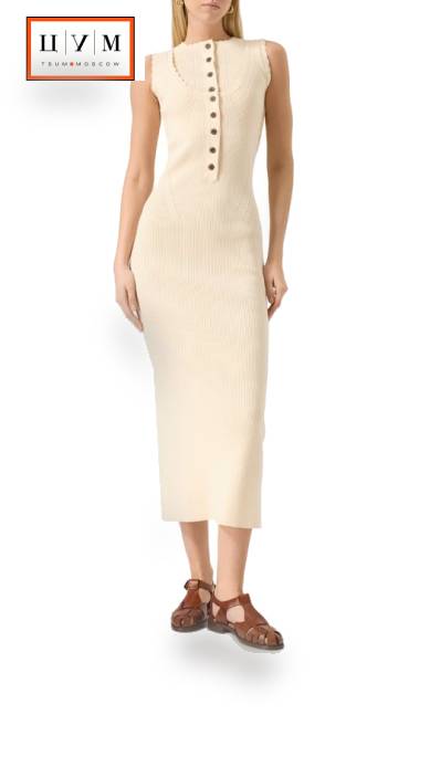 Миди-платье кажется надетым поверх парного топа благодаря вставкам над круглыми вырезами и разделенной планке с пуговицами. Модель с фестончатым кантом выполнили из ребристого смесового трикотажа на основе вискозы. Сзади на подоле – высокий разрез.