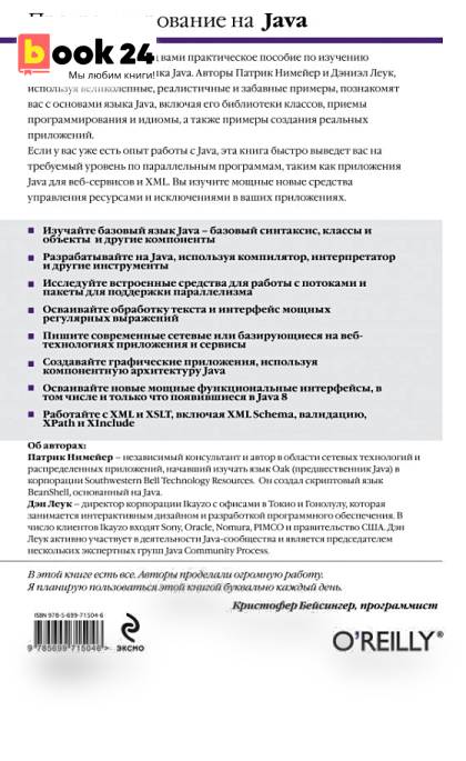 Если вы новичок, то перед вами практическое пособие по изучению свойств и интерфейса языка Java. Авторы Патрик Нимейер и Дэниэл Леук, используя великолепные, реалистичные и забавные примеры, познакомят вас с основами языка Java, включая его библиотеки классов, приемы программирования и идиомы, а также примеры создания реальных приложений.Если у вас уже есть опыт работы с Java, эта книга быстро выведет вас на требуемый уровень по параллельным программам, таким как приложения Java для веб-сервисов и XML. Вы изучите мощные новые средства управления ресурсами и исключениями в ваших приложениях.· Изучайте базовый язык Java – базовый синтаксис, классы и объекты, и другие компоненты;· Разрабатывайте на Java, используя компилятор, интерпретатор и другие инструменты· Исследуйте встроенные средства для работы с потоками и пакеты для поддержки параллелизма· Осваивайте обработку текста и интерфейс мощных регулярных выражений· Пишите современные сетевые или базирующиеся на веб-технологиях приложения и сервисы· Создавайте графические приложения, используя компонентную архитектуру Java· Осваивайте новые мощные функциональные интерфейсы, в том числе и только что появившиеся в Java 8 · Работайте с XML и XSLT , включая XML Schema, валидацию, XPath и XIncludeОб авторахПатрик Нимейер – независимый консультант и автор в области сетевых технологий и распределенных приложений, начавший изучать язык Oak (предшественник Java) в корпорации «Southwestern Bell Technology Resources». Он создал скриптовый язык BeanShell, основанного на Java.Дэн Леук – директор корпорации Ikayzo с офисами в Токио и Гонолулу, которая занимается интерактивным дизайном и разработкой программного обеспечения. В число клиентов Ikayzo входят Sony, Oracle, Nomura, PIMCO и правительство США. Дэн Леук активно участвует в деятельности Java-сообщества и является председателем нескольких экспертных групп Java Community Process."В этой книге есть все. Авторы проделали огромную работу. Я планирую пользоваться этой книгой буквально каждый день".Кристофер Бейсингер, программист