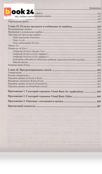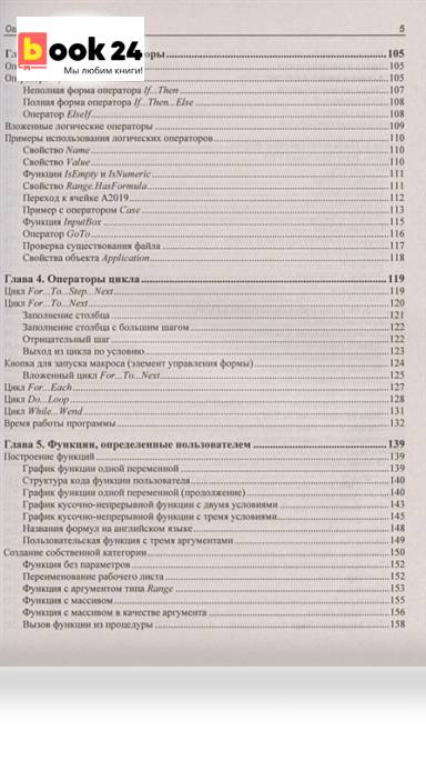 Книга научит самостоятельно создавать приложения для автоматизации работы в программе Microsoft Office Excel 2019 с использованием макросов и языка программирования Visual Basic for Applications (VBA). Приведена информация о новинках программы, а также сервисах Power по работе с данными. Даны теоретические сведения о программировании, элементах объектной модели Excel, запуске и отладке макросов. Рассмотрены вопросы автоматизации рабочего листа при помощи элементов управления Excel. Описаны приемы создания макросов, пользовательских функций и форм в редакторе VBE. Приведены способы взаимодействия при помощи VBA с другими программами пакета Microsoft Office. Для закрепления материала рассмотрены примеры пользовательских приложений с анализом и поясняющими комментариями. Основные термины VBA и редактора VBE приведены в глоссарии. Файлы рабочих книг с поддержкой макросов для каждой главы размещены на сайте издательства. Для широкого круга пользователей.