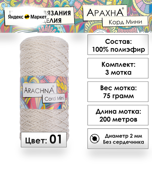 Пряжа ARACHNA "Cord Mini" 3 шт. по 75 г 200 м 100% полиэфир №01 молочный продается в интернет-магазине Яндекс Маркет
