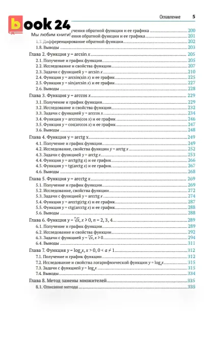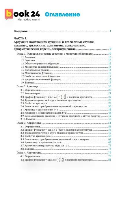 Подготовка к ЕГЭ, олимпиадам, обучению в вузе.Такие важные понятия, как арксинус, арифметический корень, логарифм числа являются в некотором смысле родственниками, ведь каждое из них - это частный случай понятия "аргумент монотонной функции". Этот факт активно используется в книге, стандартизирует и упрощает изучение всех понятий и соответствующих им функций.В части I из понятия "аргумент монотонной функции" по единому плану вводятся и изучаются его частные случаи:арксинус, арккосинус, арктангенс, арккотангенс;арифметический корень;логарифм числа.В части II вводятся и изучаются обратные функции и их частные случаи:функция y = arcsin x;функция y = arccos x;функция y = arctg x;функция y = arcctg x;функция y = n√х;функция у = logах.Изложение теории сопровождается решением многих задач разной сложности. Упражнения с ответами для самостоятельной работы, представленные в конце книги, помогут вам закрепить пройденное. Если вы готовитесь к экзамену, учитесь или преподаете в школе и вузе либо просто любите математику, это издание для вас!