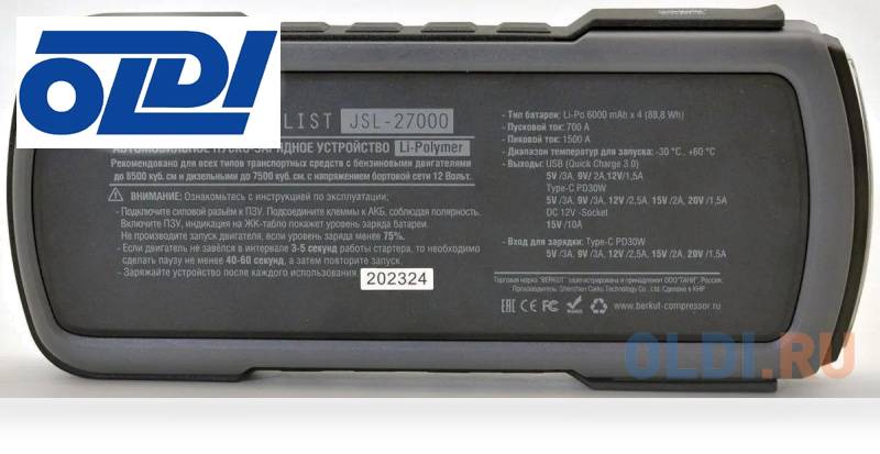 Инновационное пуско-зарядное устройство BERKUT Specialist JSL-27000 литий-полимерного типа повышенной мощности предназначено для аварийного запуска двигателя транспортного средства в случае неисправной или севшей аккумуляторной батареи.