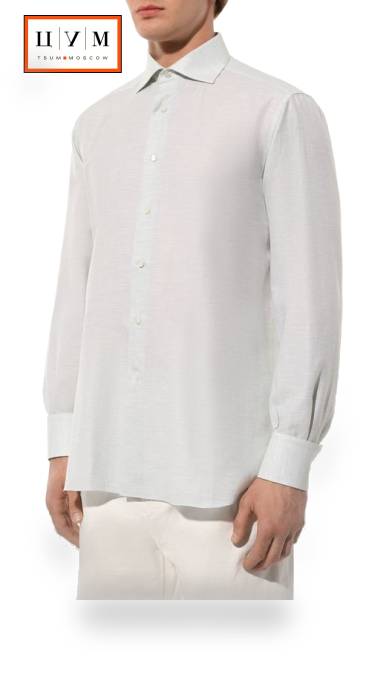 Светло-зеленая рубашка с длинными рукавами и воротником «акула» сшита из тонкой ткани на основе хлопка с добавлением шелка и льна: фактурный материал хорошо пропускает воздух и немного охлаждает кожу в жаркие дни, а четко выверенный крой гарантирует безупречную посадку по фигуре.