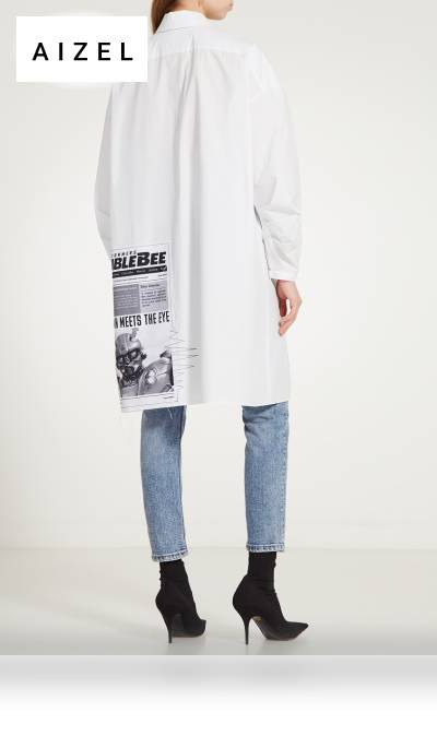 Хлопковая рубашка оверсайз со спущенной линией плеч, на спине украшенная крупным газетным принтом, а спереди — виниловой аппликацией.