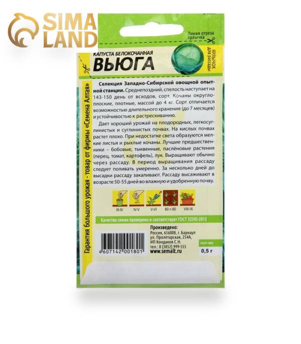 Артикул: 1573-383. Вес: 5 гр, Размер упаковки: 8 x 0.1 x 15 см, Температурное ограничение: Нет, Агрономический срок годности, лет: 5, Вид капусты: Белокачанная, Сорт или гибрид: Сорт, Сроки созревания: Поздний, Посев на рассаду: Ноябрь - Апрель. Селекция Западно-Сибирской овощной опытной станции. Среднепоздний, спелость наступает на 143-150 день от всходов. Кочаны округло-плоские, плотные, массой до 4 кг Сорт отличается возможностью длительного хранения (до 7 месяцев) и устойчивостью к растрескиванию. Дает хороший урожай на плодородных, хорошо оструктуренных, дренированных почвах с нейтральной реакцией среды. Предпочитает освещенные участки, не выносит затенения. Лучшие предшественники бобовые, тыквенные, картофель, морковь, лук. Выращивают обычно через рассаду. Оптимальная температура для выращивания +15-28℃, ночью +12-14℃. Глубина заделки 2,0-2,5 см При слишком высокой температуре воздуха рассада вытягивается. В период выращивания рассаду следует поливать умеренно. За несколько дней до высадки, рассаду закаливают. Посадочный интервал 60х60 см Рассаду высаживают в возрасте 50-55 дней во влажную, удобренную почву. В течение всего сезона растениям необходимы регулярные обильные поливы, своевременные прополки, рыхление и подкормки азотными и калийными минеральными удобрениями. Хорошо отзывается на внесение микроудобрений, содержащих магний и бор.