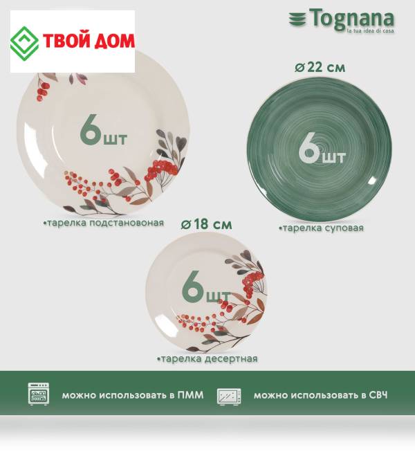 Набор керамической посуды включает: тарелки обеденные 26,5 см. - 6 шт, тарелки десертные 20 см. - 6 шт, тарелка глубокая 20 см/ 750 мл - 6 шт.