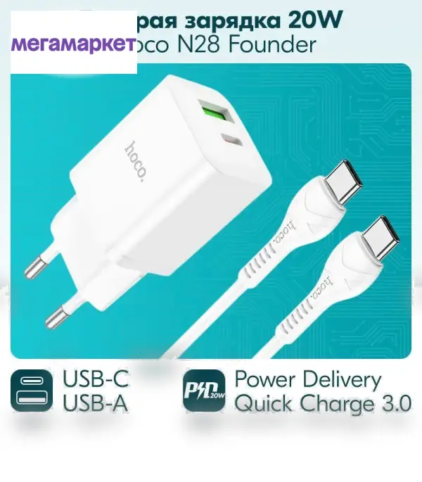 Сетевое зарядное устройство Hoco N28 type-c - type-c 1x USB Type A; 1xUSB Type-C 3 А продается в интернет-магазине МегаМаркет