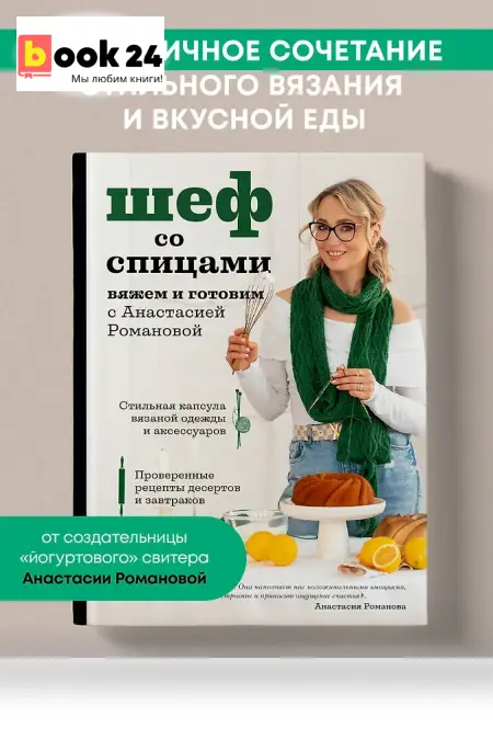 Об авторе: Анастасия Романова \ romnastena — дизайнер вязаных изделий. По образованию юрист и экономист, работала в коммерческом банке. С 2017 года стала вязать профессионально. По-настоящему большой успех, огромную аудиторию и множество единомышленников ей принес легендарный «йогуртовый» свитер. Сегодня по мастер-классам Анастасии вяжут более 90 000 человек! Вязание для нее — дело всей жизни. Это творческая реализация и любимая работа.