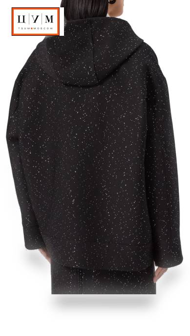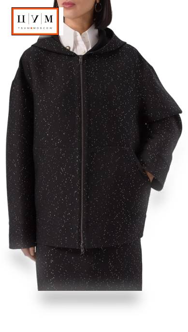 Бомбер, расшитый пайетками, станет акцентом в образе или поладит с парной миди-юбкой. Модель кроя oversize выполнили из шерсти, а для подклада выбрали шелк. Спереди предусмотрели крупный карман «кенгуру». Куртка с капюшоном, плотными манжетами и поясом застегивается встречной молнией.