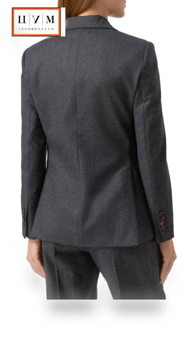 Для пошива жакета с подкладкой использовали меланжевую шерсть. Модель с двумя шлицами сзади дополнили парой боковых карманов и одним нагрудным, который украсили геральдической нашивкой.