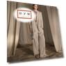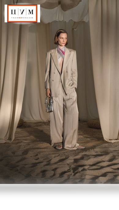 Для производства кремового двубортного пиджака с заостренными лацканами, как у смокинга, мастера марки использовали мягкую плотную шерсть с шелковистым блеском. Этим же материалом обтянули и круглые пуговицы. Модель полностью очистили от цветовых акцентов, сделав изделие спокойного оттенка максимально лаконичным.