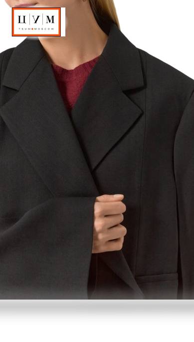Свободный жакет с приспущенной линией плеч и прямоугольными лацканами дополнили боковыми карманами. Двубортную модель на потайных пуговицах сшили из шерсти первого пострига.