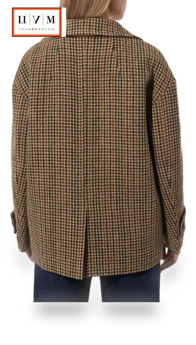 Жакет с узором «пье-де-пуль» выполнили из шерсти, а подкладку — из стеганой ткани на основе полиэстера и вискозы. Изделие со спущенной линией плеч дополнили широкими патами и крупной нашивкой.