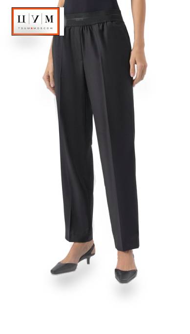 Брюки со стрелками выполнили из шерсти. Один из четырех врезных карманов изделия украсили брендированной пластиной. Модель дополнили широким поясом-резинкой с логотипами марки.