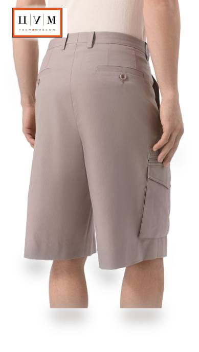 Шорты длиной до середины колена сшили из хлопкового твила с добавлением шерсти и шелка. Модель с защипами спереди дополнили двумя боковыми и парой задних карманов, а в накладные карго с клапанами интегрировали прорезные с молниями.