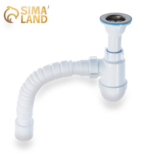 Сифон бутылочного типа предназначен для кухонной мойки с диаметром сливного отверстия 50 мм. Выполнен с литым выпуском и нержавеющей решёткой. Для подключения к канализации комплектуется гибкой трубой размером 40 × 50 мм.