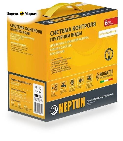 Neptun Bugatti Base - это лучшее соотношение цены и качества. Модуль управления Neptun Base - простое, но при этом очень надежное устройство. Дополнительных функций не много, но если они Вам и не нужны, то это идеальное решение. Главное, что в комплекте идут зарекомендовавшие себя шаровые краны Neptun Bugatti, которые едут напрямую с завода в Италии. У электропривода большое усилие (ломает карандаши), которое никогда не будет лишним с учетом не очень качественной водоподготовки в России, в кране используются самые лучшие уплотнительные материалы (первичный фторопласт, который выдерживает даже серную кислоту) и конечно же - есть ручное аварийное открывание на случай, если не будет питания или электроника выйдет из строя.