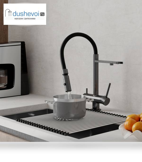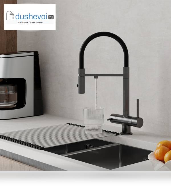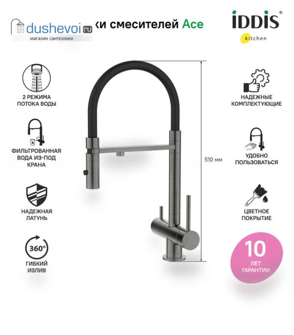 Смеситель Ace в черном цвете выделяется привлекательным дизайном и функциональностью, без которой не обойтись на современной кухне. Модель помогает эффективнее справляться с повседневными задачами. Отдельный канал для фильтрованной воды дает доступ к чистой питьевой воде прямо из-под крана. Гибкий излив позволяет направить струю воды в нужную точку кухонной мойки. При этом руки остаются свободными благодаря держателю для излива на корпусе. Магнитный замок надежно фиксирует излив после использования.