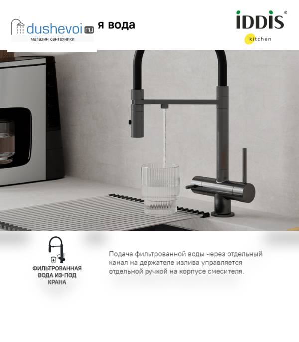 • Излив IDDIS® из термостойкого силикона просто содержать в чистоте благодаря гладкой поверхности и высокой устойчивости силикона к грибку. Материал приятен на ощупь и легко моется обычным моющим средством.