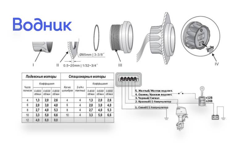Тахометр 0-6000 об/мин. Подходит для стационарных и подвесных моторов. Цифровая индикация моточасов. Ободок выполнен из нержавеющей стали. Посадочный диаметр 85 мм.