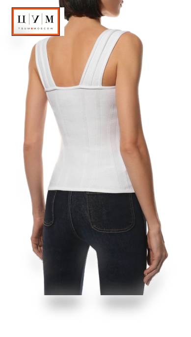 Белый топ из в весенне-летней коллекции станет удачным вложением в базовый гардероб. Кроме универсального оттенка, рифмующегося с тонами любой палитры, у модели есть еще одно преимущество. Изделие с фактурными полосами выполнили из эластичного вискозного трикотажа на японской вязальной машине, позволяющей создать скульптурный силуэт без единого шва.