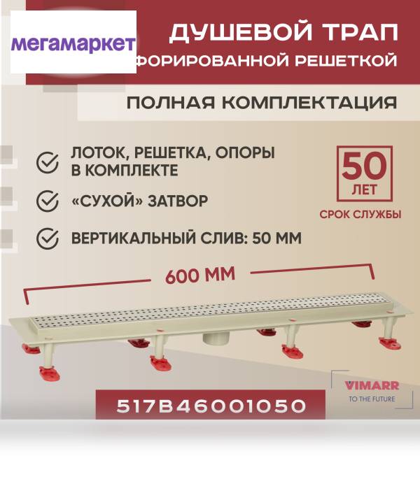 Трап линейный Vimarr с вертикальным выходом D50 мм, с решеткой хром продается в интернет-магазине МегаМаркет