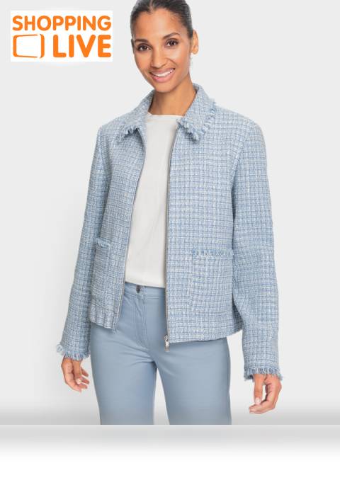Модный жакет вошел в новую коллекцию Coast Vibes от немецкого бренда Olsen. Модель выполнили из фактурного твида на основе дышащего мягкого хлопка с добавлением шелковистого акрила. Фактуру материала, усиленного волокнами полиэстера, поддержали бахромой на отложном воротнике, рукавах и накладных карманах, создав эффект необработанного края. Изделие на подкладке четко держит форму и практически не мнется. Эластичный пояс способствует комфортной посадке. Элегантный твидовый жакет на молнии можно носить не только поверх топов, но и на голое тело. Такая вещь гармонично впишется как в повседневный, так и в нестрогий офисный образ.