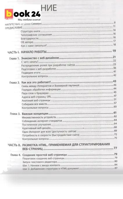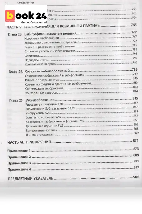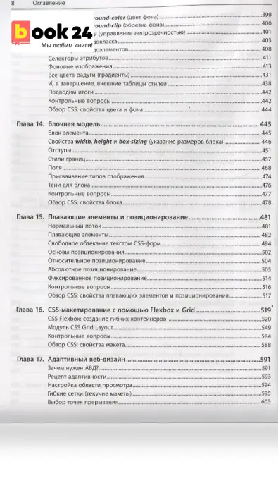 Книга поможет освоить веб-дизайн, не имея опыта. На практических примерах показано, как создать простой сайт и постепенно его совершенствовать. Рассказано о создании веб-страниц, содержащих текст, ссылки, изображения, таблицы и формы. Описано применение CSS для создания и выбора цвета, фона, форматирования текста, макетирования страниц и выполнения простой анимации. Даны основы языка JavaScript и подчеркнута его важность в веб-дизайне. Описано создание, оптимизация и сокращение времени загрузки веб-изображений. В каждой главе представлены упражнения, которые позволят освоить описанные методики, и краткие контрольные вопросы для закрепления ключевых понятий. В пятом издании добавлен материал об использовании CSS Flexbox и Grid для создания сложных и гибких макетов страниц, тонкостях адаптивного веб-дизайна для отображения веб-страниц на экранах любых устройств, о работе с командной строкой, Git и другими инструментами веб-дизайнера, а также применении SVG-изображений.