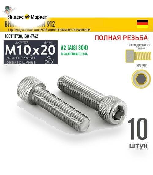 Винт цил. гол. M10х20/20 в/ш нерж. А2 DIN 912 ПР, 10 шт продается в интернет-магазине Яндекс Маркет
