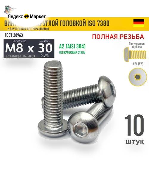 Винт п/кр M8х30 в/ш нерж. А2 ISO 7380, 10 шт продается в интернет-магазине Яндекс Маркет