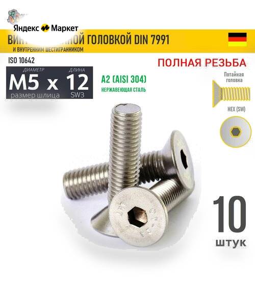 Винт потай M5х12 в/ш нерж. А2 DIN 7991, 10 шт продается в интернет-магазине Яндекс Маркет